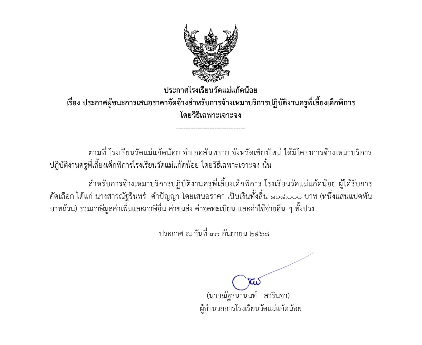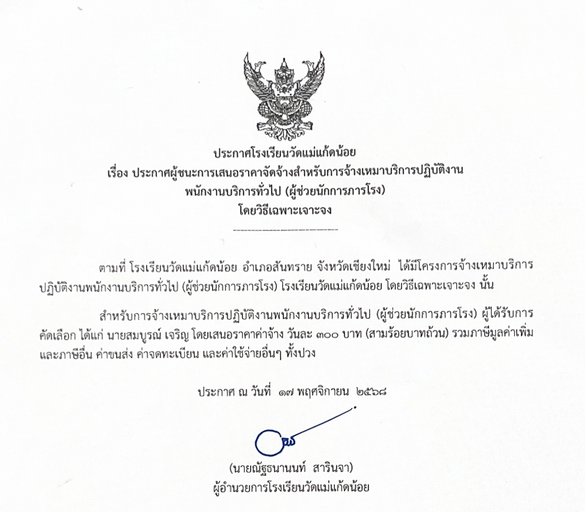 ประกาศ โรงเรียนวัดแม่แก้ดน้อย เรื่อง ประกาศผู้ชนะการเสนอราคาจัดจ้างสำหรับการจ้างเหมาบริการปฏิบัติงานตำแหน่งธุรการโรงเรียน ครูพี่เลี้ยงเด็กพิการ นักการภารโรง โดยวิธีเฉพาะเจาะจง