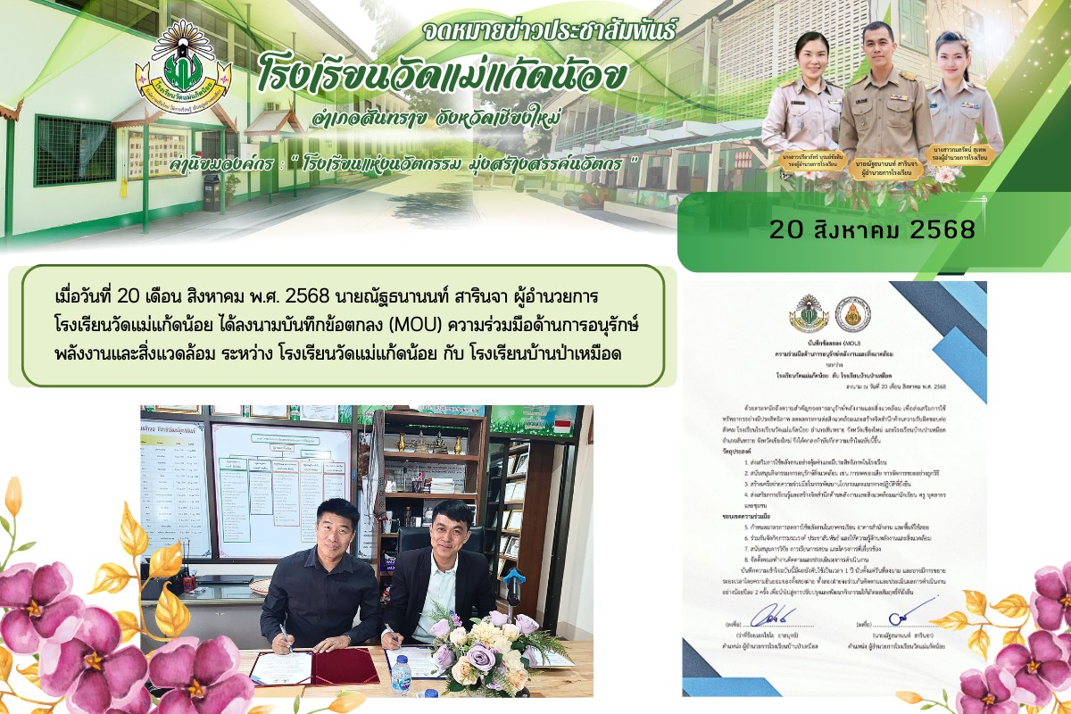 เมื่อวันที่ 4 เดือน สิงหาคม พ.ศ. 2568 นายณัฐธนานนท์ สารินจา ผู้อำนวยการโรงเรียน ได้ลงนามบันทึกข้อตกลง (MOU) ความร่วมมือด้านการอนุรักษ์พลังงานและสิ่งแวดล้อม ระหว่าง โรงเรียนวัดแม่แก้ดน้อย กับ โรงเรียนบ้านป่าเหมือด ทั้งนี้ ด้วยตระหนักถึงความสำคัญของการอนุรักษ์พลังงานและสิ่งแวดล้อม เพื่อส่งเสริมการใช้ทรัพยากรอย่างมีประสิทธิภาพ ลดผลกระทบต่อสิ่งแวดล้อมและสร้างจิตสำนึกด้านความรับผิดชอบต่อสังคม