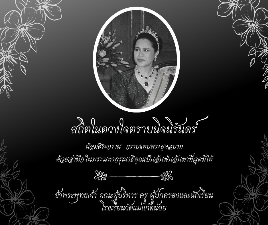 สถิตในดวงใจตราบนิจนิรันดร์ น้อมสำนึกในพระมหากรุณาธิคุณเป็นล้นพ้นอันหาที่สุดมิได้ ข้าพระพุทธเจ้า คณะผู้บริหาร ครู ผู้ปกครองและนักเรียน โรงเรียนวัดแม่แก้ดน้อย
