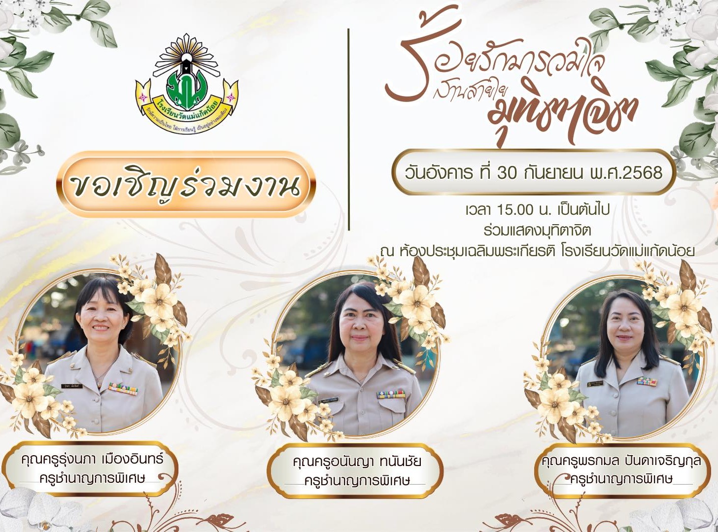 โรงเรียนวัดแม่แก้ดน้อย ขอเชิญร่วมงาน"แสดงมุทิตาจิตแด่ครูผู้เกษียณอายุราชการ ประจำปี 2568" วันอังคารที่ 30 กันยายน พ.ศ. 2568 ณ ห้องประชุมเฉลิมพระเกียรติ โรงเรียนวัดแม่แก้ดน้อย เวลา 15.00 น. เป็นต้นไป *สามารถจอดรถได้ที่บริเวณ สนามหน้าวัดแม่แก้ดน้อย*