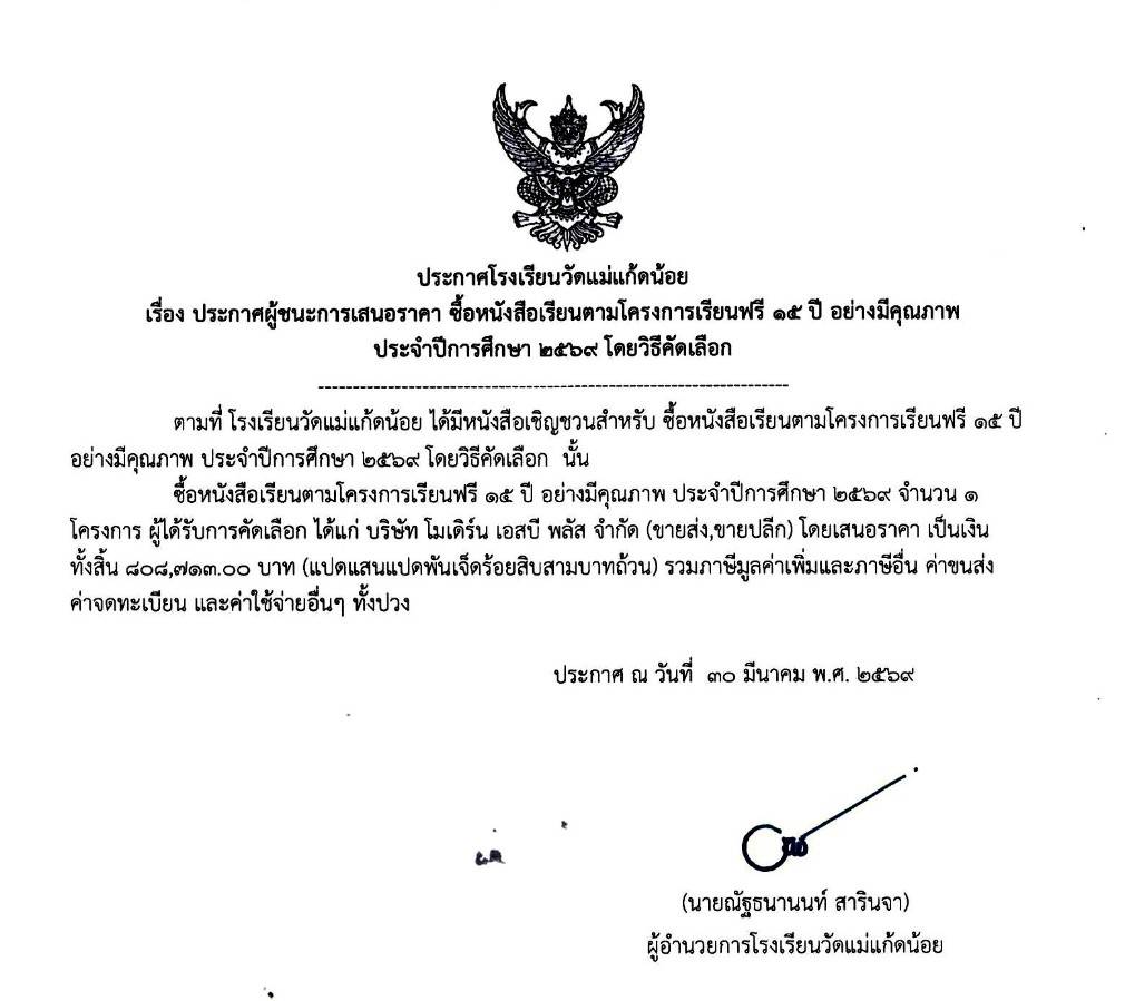 ประกาศ โรงเรียนวัดแม่แก้ดน้อย เรื่อง ประกาศผู้ชนะการเสนอราคาจัดจ้างสำหรับการจ้างเหมาบริการปฏิบัติงานตำแหน่งธุรการโรงเรียน ครูพี่เลี้ยงเด็กพิการ นักการภารโรง โดยวิธีเฉพาะเจาะจง